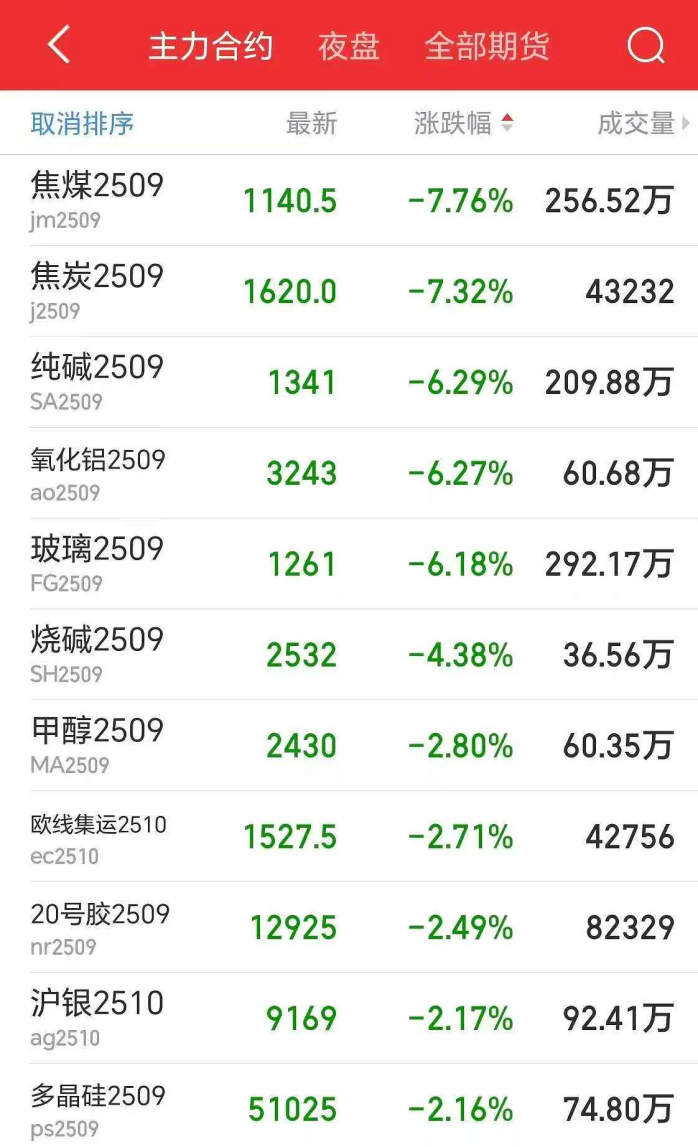 周五A股周期股全线大跌后,周五夜盘,焦煤、纯碱、玻璃等商品期货全线调整,预计周一反内卷概念可能会继续承压。